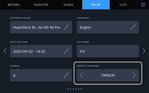 If the HyperDeck does not know what video standard to use, it will use this default. It will always record the video input standard. It will always playback the format on disks. If there are multiple formats, it will use the default standard first.