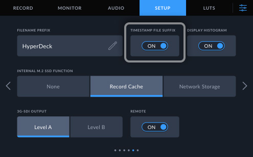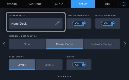 When recording files, the HyperDeck can add specific text as the start of the filenames used on the recorded media clips. This setting allows you to customize this name. You could set it to the HyperDeck name, a camera number or even a job name.