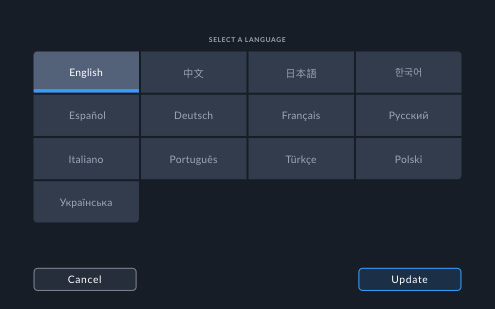 The language menu lets you set the language used in the menus and on screen overlays on the monitoring output. You can change to English, Chinese, Japanese, Korean, Spanish, German, French, Russian, Italian, Portuguese, Ukrainian, Polish and Turkish.