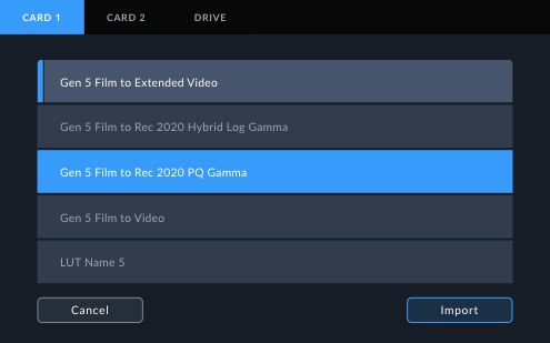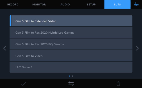 Display LUTs can be applied for the LCD display as well as the SDI monitor out. To select a 3D Look Up Table (LUT), simply tap on it in the list. The LUT will be highlighted in blue and then you can click the button to make it the current 3D LUT.
