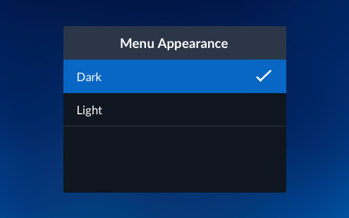 The menus on the HyperDeck Shuttle HD overlay can be set to either light and dark appearance. The light background has black text. Dark appearance has a black background with white text. The dark appearance is great for control rooms with low light.