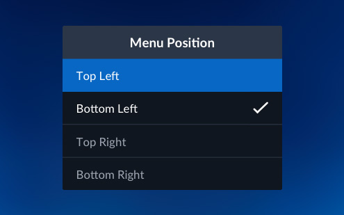 Depending on the work you do, you might need to move the HyperDeck Shuttle HD menu overlay to a different location on screen. Move the menus to the top left, bottom left, top right, or bottom right. The default setting is bottom left of the screen.