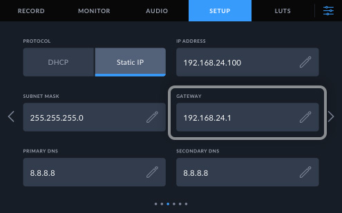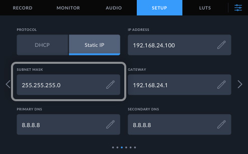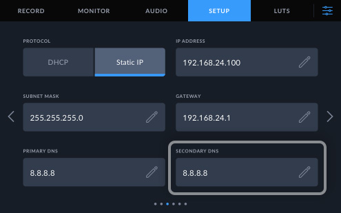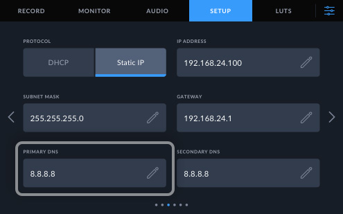 The primary DNS setting is a network setting and is used when the HyperDeck needs to translate a human-readable hostname into an IP address. This setting allows the HyperDeck to find and communicate with a DNS server to lookup the hostname.