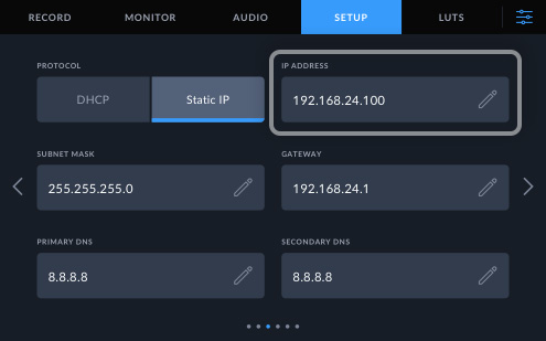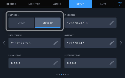 The network protocol menu is how the HyperDeck Shuttle will connect to the Ethernet network. You can choose DHCP where the HyperDeck Shuttle will get assigned an IP address automatically, or static IP where you can set the network address manually.