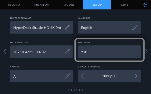 The software menu lets you know the HyperDeck Shuttle software version. You can update the software using a computer connected via USB or Ethernet. We often release updated software with new features, so this menu lets you know you are up to date!