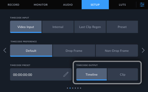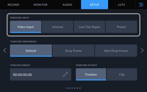 The timecode input is the source used when recording video. The video input setting can use embedded SDI or HDMI timecode sources. Or you can use the "last clip regen" to use the timecode from the last recorded clip, or even a specific preset value.
