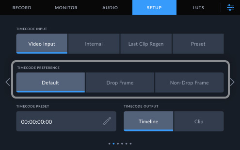The timecode preference lets you use either drop frame or non-drop frame timecode. When set to drop frame, the LCD timecode will change to use semicolons. Drop frame timecode is used for correct time of day timecode when using 59.94 fps standards.