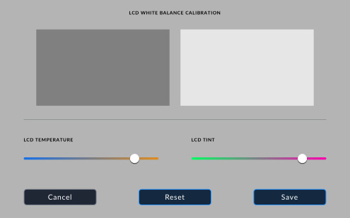 To calibrate the LCD white balance, adjust the 'LCD temperature' and 'LCD tint' controls until the two reference patches appear neutral in color. After changing the settings, press the reset button to return the controls to factory calibration.