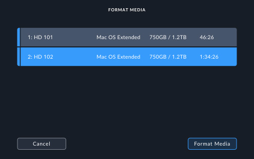 The format menu allows you to erase and format a media disk on HyperDeck Shuttle HD models. This means you can format media from the HyperDeck without moving it to a computer. Disks can be formatted to HFS+ for Mac or ExFAT for Windows and Mac.