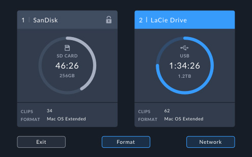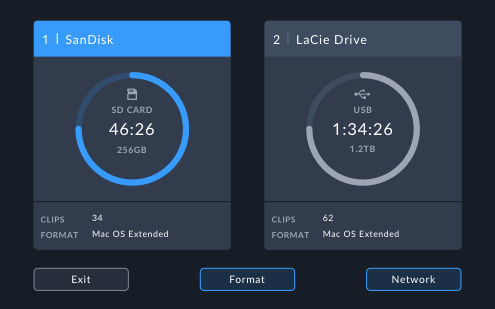 The HUD storage icons show media card, USB-C disk, and network storage details and status. You can see capacity, remaining space, clip count and format of each media card or network disk. You can also tap to mount network disks and format cards.