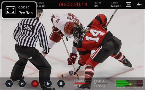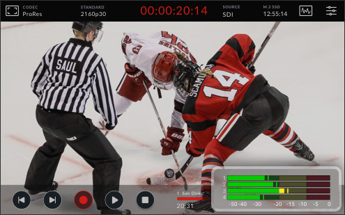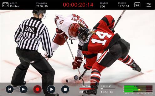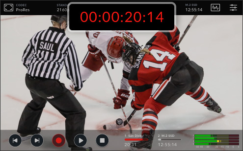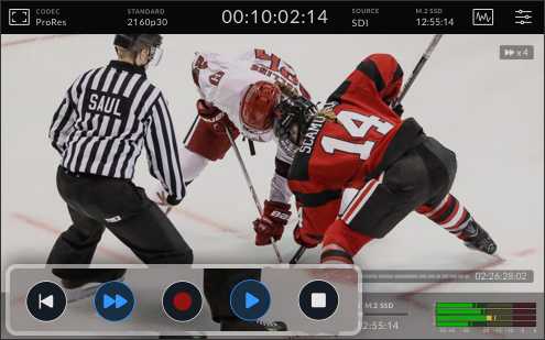 The HyperDeck Shuttle 4K Pro features a heads up display (HUD) that displays video footage of recording and playback, as well as the ability to change settings. The HUD overlays the most important settings so you can see the resolution, frame rate, codec, timecode, recording status and audio levels while you record. You can also hide the heads up display by simply swiping up or down on the LCD. For example, you can modify settings like the recording codec by tapping on the codec name or adjust the audio levels by touching the audio meters. Everything is interactive, so you can instantly change the settings of any item by simply tapping it, eliminating the need to search through confusing menus!