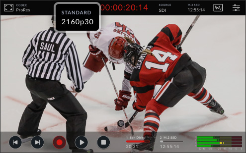 HyperDeck Shuttle lets you record all television standards and frame rates. You can record in SD and HD up to 1080p60, and on the HyperDeck Shuttle 4K Pro, you can record Ultra HD up to 2160p60. The HUD will display the input video standard.