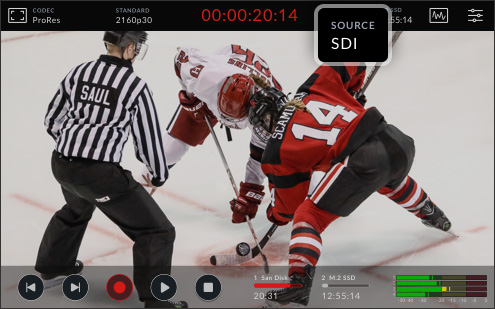 The source indicator in the heads up display indicates the currently used video connection that's being used as the record source. Simply tap to switch between SDI and HDMI inputs. You can do it right from the HUD, without going into any menus!
