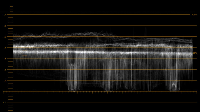 The waveform display provides a digitally encoded waveform that shows the luma (brightness) levels of your video signal. Luma levels on the scope will be in roughly the same position relative to those within the frame. For example, if part of your sky is overexposed you will see it in the same horizontal position on the waveform display as it appears in the frame. Depending on your footage, your waveform will look different. If you are monitoring video which is high contrast, you might not see any values in the mid grays. However if your video levels are low, you might see most of the waveform down the bottom of the scope. You could increase gain and watch the waveform rise up towards the top of the scope.
