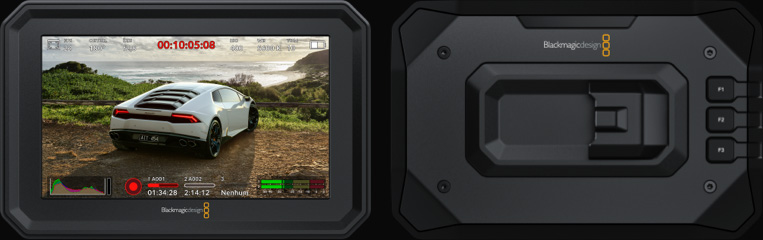 A Blackmagic PYXIS foi projetada para ser equipada com trilhos, gaiolas ou outros acessórios. No entanto, essas configurações podem, ocasionalmente, obstruir o monitor integrado. O Blackmagic PYXIS Monitor oferece uma opção de monitoramento adicional compatível com o design da câmera e seus próprios acessórios de montagem. Ele inclui até um acelerômetro, permitindo montar o monitor em qualquer orientação e ainda visualizar a imagem perfeitamente. Você pode até montá-lo separado da câmera, em acessórios como gimbals, para monitoramento e controle de câmera completos, mesmo quando a câmera estiver fora de alcance. Ele também inclui uma luz de sinalização para que você possa ser tanto o apresentador quanto o operador de câmera, trabalhando como uma equipe de produção solo.