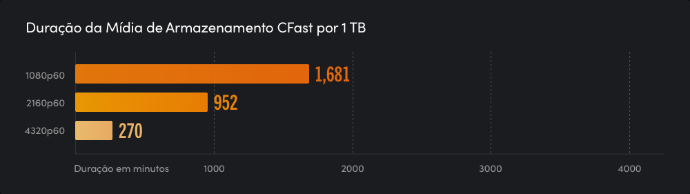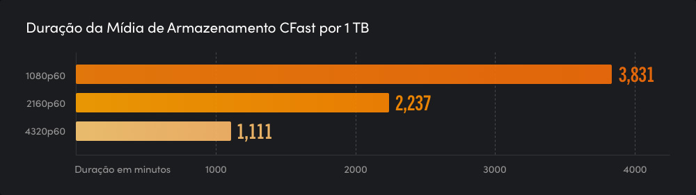 O suporte às mídias CFast possibilita gravar em cartões de memória flash prontamente disponíveis. Os arquivos H.265 são suficientemente pequenos para possibilitar gravações longas em cartões CFast padrão. Além disso, há 2 compartimentos CFast para que você possa trocar os cartões cheios mesmo durante uma gravação, permitindo gravações de duração infinita. Os cartões CFast são ideais para a teledifusão porque são pequenos, velozes e acessíveis. Você pode até usar uma Blackmagic MultiDock 10G para adicionar compatibilidade com SSDs. Com H.265, você pode gravar 1.398 minutos em 8Kp60 em um cartão de 1 TB, 3.530 minutos em 2160p60 Ultra HD e 9.446 minutos em 1089p59.94 em um cartão de 1 TB. São mais de 23 horas em 8K e mais de 6 dias em HD!