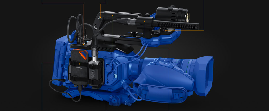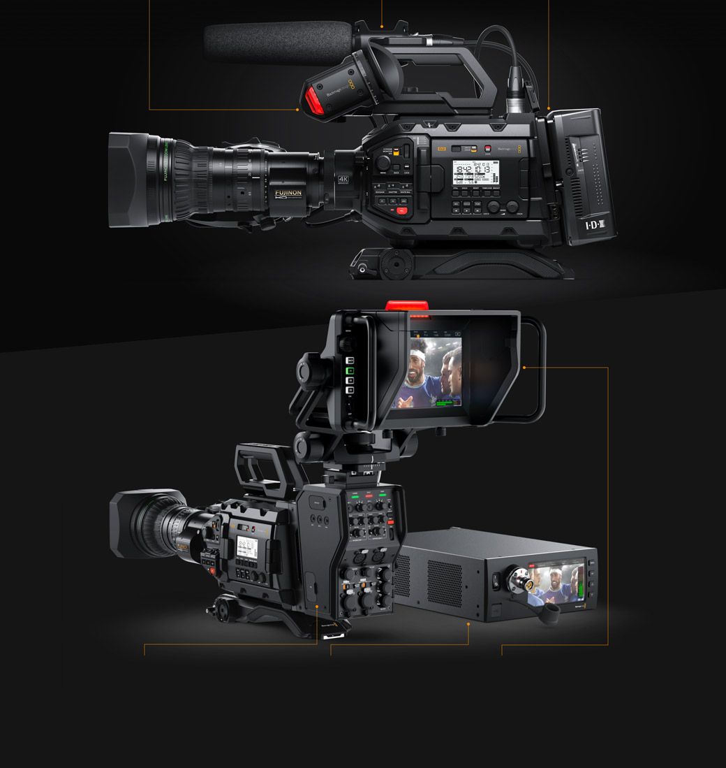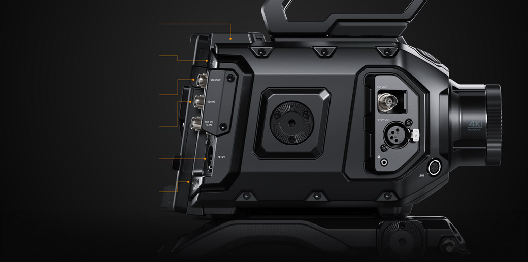 URSA Broadcast G2 features a super strong, lightweight magnesium alloy body that’s perfectly balanced and designed to be comfortable to use all day! It features familiar externally mounted switches and controls that give you direct access to the most important camera settings. The controls are laid out logically, making them easy to locate by feel, so you can adjust settings without having to look at the buttons. You also get a foldout touchscreen for monitoring, viewing camera status and changing settings using on screen menus. URSA Broadcast G2 also includes standard 12G-SDI connections, XLR audio inputs, USB-C and an industry standard 4 pin XLR broadcast 12V DC connection!