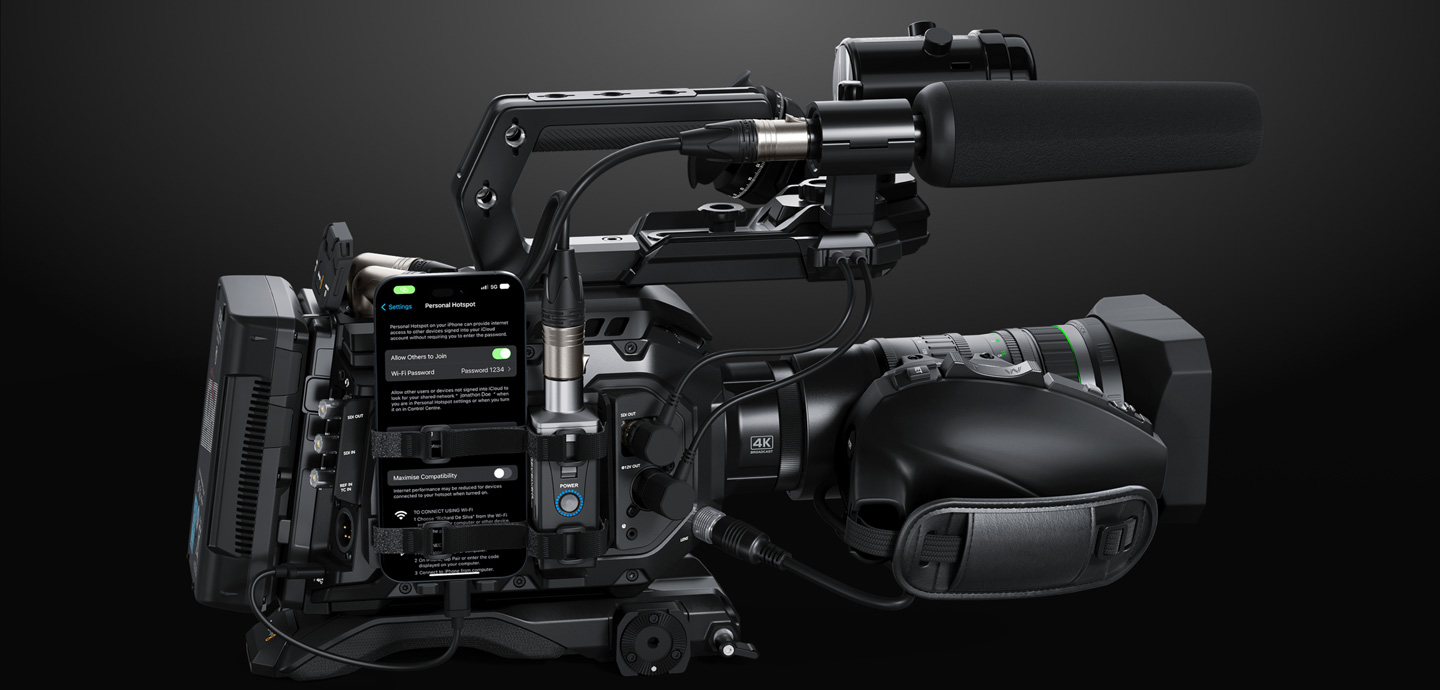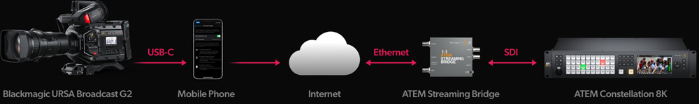 Now you can live stream to the world! Blackmagic URSA Broadcast G2 features a built hardware streaming engine that supports both RTMP and SRT streaming protocols so you can go live to YouTube, Facebook, X and more! For internet access, you have two options, one to connect a USB-C to Ethernet adapter or you can connect a 4G or 5G phone for mobile data! Plus if you want to create a wireless link back to the studio, then you can stream to a Blackmagic ATEM Streaming Bridge, which is an H.264 decoder that converts the video stream back to SDI video. Plus the ATEM Streaming Bridge can send full camera control, on air tally and even talkback audio back to the remote camera!