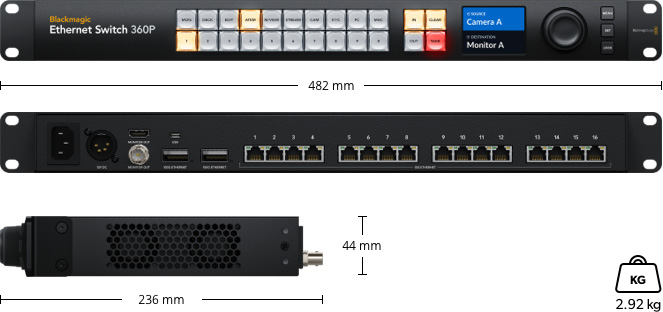 Blackmagic Ethernet Switch 360P is the first Ethernet switch designed specifically for the film and television industry. It is a high performance low latency Ethernet switch with 16 fast 10G Ethernet and 2 high speed 100G Ethernet ports, QSFP connection for high speed copper cables or longer optical fiber cables, rear Ethernet connections for better cable management and NMOS protocol for 2110 IP video workflows.