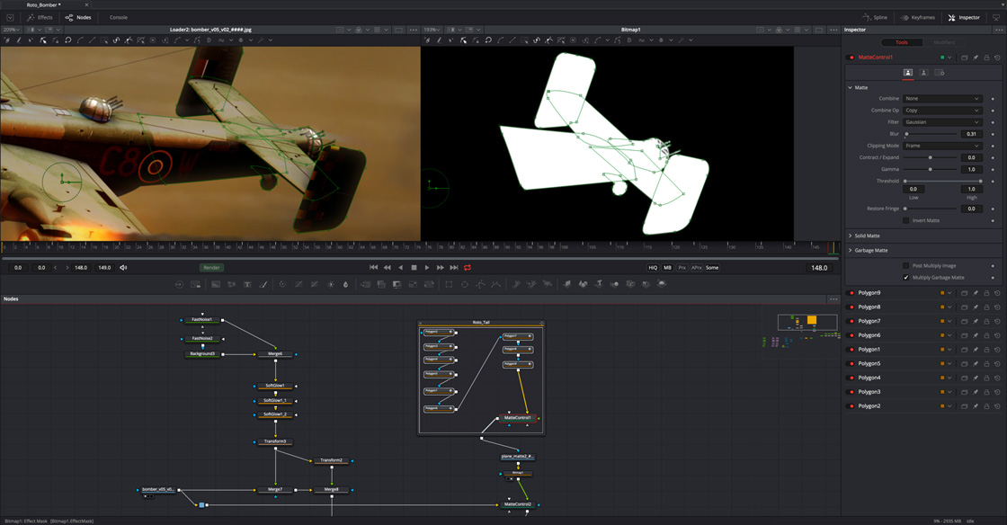 Rotoscoping uses shapes to isolate actors or objects from other elements in a shot. Fusion’s bezier and B-spline tools let you quickly draw, track and animate custom shapes. Planar tracking data can be used on shapes so you don’t have to manually animate motion, perspective, position, scale or rotation as the image changes!