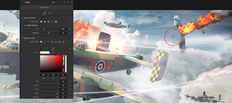 Fusion’s resolution independent paint tools feature flexible brush styles, blend modes and stroke shapes that can be modified at any time! Use the paint tool to quickly remove wires, rigs or other unwanted elements. Simply clone one area to another, smear an image with a brush stroke, or even paint entirely new elements!