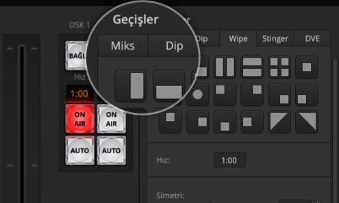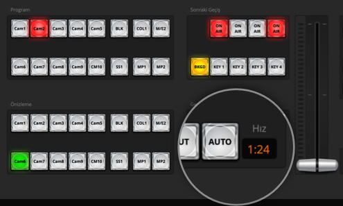 Geçişlerin sürelerini, istediğiniz şekilde ayarlayabilirsiniz; ardından, kusursuz bir biçimde zamanlanmış ve yumuşak geçişler için ‘auto’ butonunu kullanın. Bu buton etkinleştirildiğinde, kaynaklar arasında değiştirme işlemi, geçişi otomatik olarak ilave edecektir. Miks, daldırma, silme, DVE ve benzeri birçok efekt için, ‘auto’ butonunu kullanın! Program/önizleme miksaj moduna ayarlıyken, ‘auto’ butonu geçişleri tetiklemeye değişir.