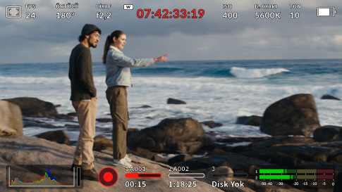 Blackmagic Cloud’a kayıt yaparken seçtiğiniz projenizin adı, zaman kodu göstergesinin üzerinde görüntülenir. Bir sonraki klip kaydedişinizde, kameranız bu klibi otomatik olarak seçili bulut projesine yüklemeye başlar.