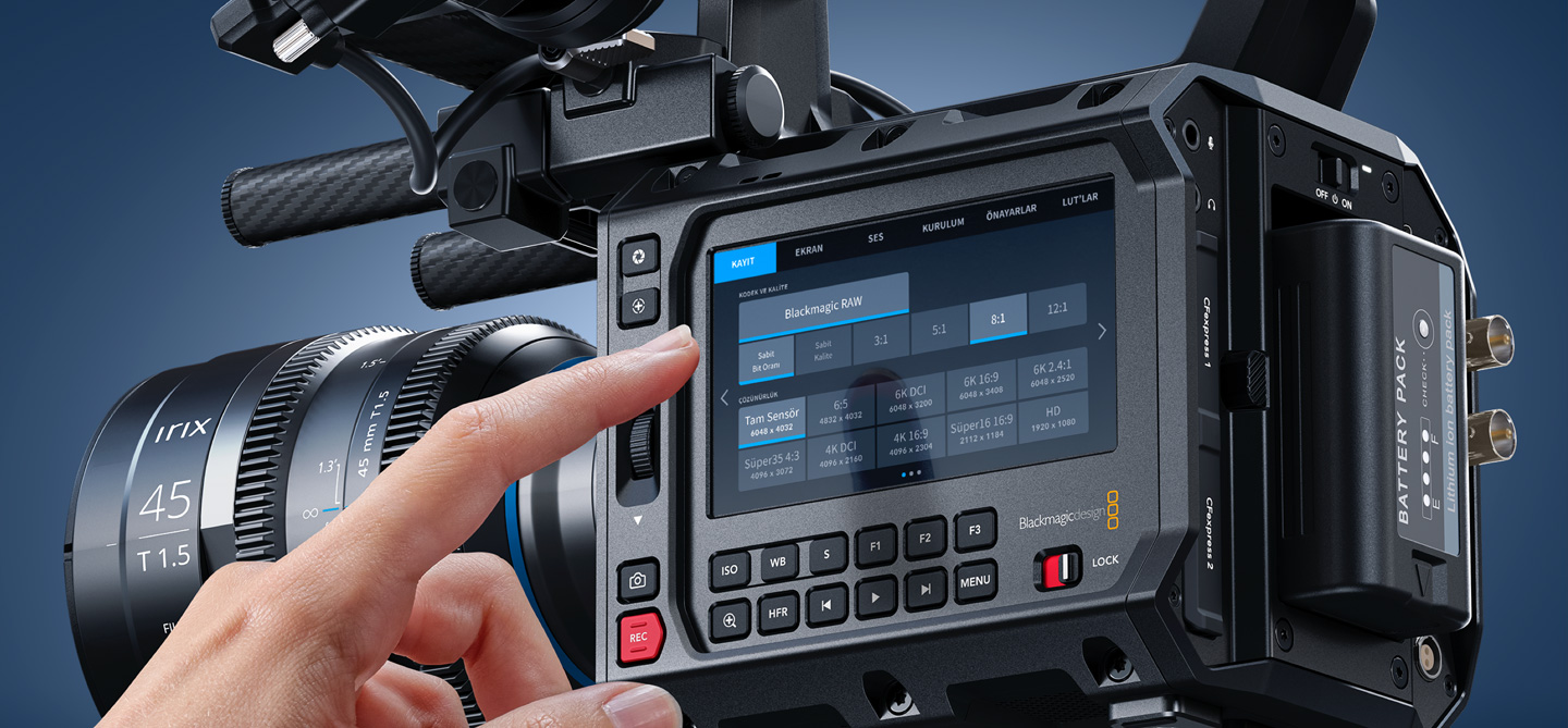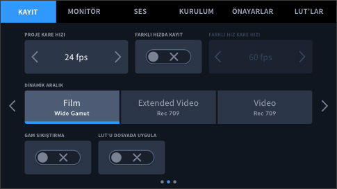 Kayıt sekmesi; kayıt formatını, çözünürlüğünü, kare hızını ve benzeri özellikleri seçmeniz için kullanımı hızlı ve devrimsel bir arayüz sunar! Blackmagic RAW'ı tıkladığınızda; sıkıştırma oranları gibi ilgili varyasyonlar altlarında aydınlatılır, böylece seçiminizi yapıp çözünürlüğü seçebilirsiniz. Ayrıca kayıt sekmesi; film, geniş video veya video için dinamik aralığı da ayarlamanıza olanak tanır. Sensör alanı düşürülmüş modu, kare hızını, tercih ettiğiniz karta kaydetme seçeneklerini, hızlandırılmış çekim ayarını, keskinleştirme seviyesini ve benzeri parametreyi ayarlayabilirsiniz!
