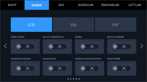 Monitör sekmesi; ana SDI çıkışı ve dahili dokunmatik LCD ekran üzerinde görüntülenen her şeyin üzerinde mutlak kontrol sağlar! Her çıkışın bağımsız katmanları olabilir ve tüm çıkışlara ya da herhangi bir çıkışa göndermek üzere; temiz sinyal, zebra, netlik yardımı, çerçeve kılavuzları gibi birçok katman seçebilirsiniz. Hatta çözünürlüğü belirleyebilir ve her çıkış için LUT bile seçebilirsiniz! En güzeli de görüntü yönetmeni ve yönetmen için, farklı durumları görüntülemeyi tanımlayabilir ve daha sonra bu bilgiyi, SDI çıkışına göndererek doğru kişilerin doğru bilgileri görmesini sağlayabilirsiniz!