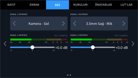 İnteraktif denetim merkezi ekranını kullanarak, ses seviyelerini hızla ayarlayabilirsiniz. Ayrıca ses ayarları üzerinde tam kontrol için, gösterge panelindeki ses sekmesini de kullanabilirsiniz. Girişleri, kamera mikrofonu ile mini XLR arasında değiştirebilir, kulaklık ve hoparlör seviyelerini, mikrofon seviyelerini, bas frekansları kesen ‘low cut’ filtresini ve bunlar gibi daha nicesini ayarlayabilirsiniz. Ses girişi ayarlarını düzenlerken, kanal 1 ve 2 için mikrofon veya hat seviyelerini bağımsız olarak kullanmayı seçebilir, güç gerektiren mikrofonları kullanabilmek için 48v fantom gücü açabilir ve kazancı ayarlayabilirsiniz.