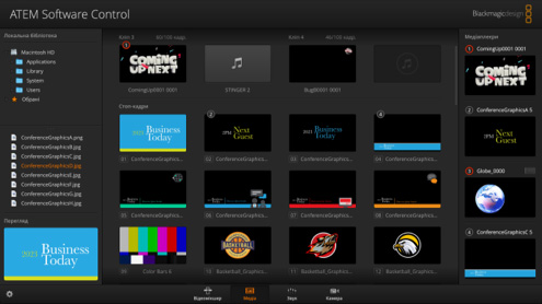 Знайти дилераПрограмна панель ATEM Software Control забезпечує швидке та точне керування відеомікшером. Усі інструменти згруповані за функціональною ознакою (аудіо, макрокоманди, робота з самим пристроєм, медіаматеріалами та декою), тому їх легко знайти на відповідній сторінці. Кожна з них має зручний інтерфейс із знайомим розташуванням кнопок для вибору джерел, переходів та модулів кеїнгу. Налаштування окремих параметрів виконується на додаткових вкладках. Крім того, програма дозволяє систематизувати та завантажувати графічні файли, а також використовувати багатоканальний звуковий блок Fairlight.