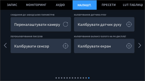 Blackmagic PYXIS має панель інструментів із простим і зрозумілим програмним інтерфейсом, який дозволяє оператору швидко налаштувати будь-які параметри зйомки. Шість вкладок — «ЗАПИС», «МОНІТОРИНГ», «АУДІО», «НАЛАШТ.», «ПРЕСЕТИ» та «LUT-ТАБЛИЦІ» — забезпечують зручний доступ до всіх функцій камери та вибір потрібних опцій кількома дотиками. Розташування елементів легко запам'ятати завдяки групуванню за логічною ознакою та візуальному оформленню, що значно пришвидшує роботу з меню.