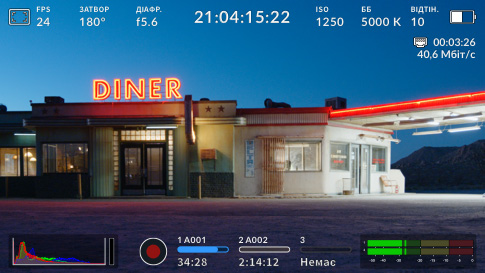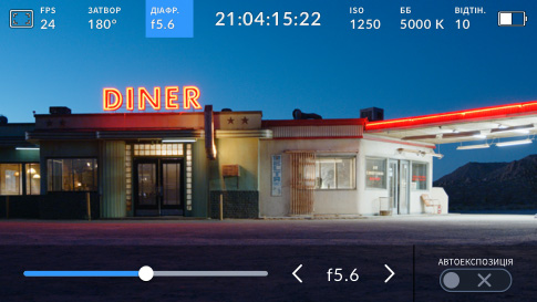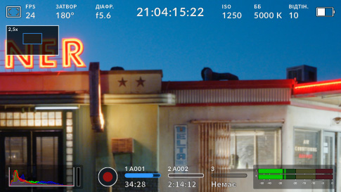 Дисплей дозволяє виводити таку інформацію, як кадрова частота, кут затвора, діафрагма, тайм-код, ISO, ім'я проекту на хмарному сервісі та стан стрімінгу, баланс білого та рівні звуку. Ці параметри можна показати або приховати, провівши пальцем по екрану у вертикальному напрямку. Якщо потрібно змінити окремі налаштування, достатньо торкнутися відповідного індикатора. Всі елементи інтерфейсу є інтерактивними, тому для доступу до них більше не доведеться вести пошук по складному меню.