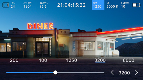 Цей параметр регулює чутливість сенсора до світла. ISO 100 підходить для зйомки надворі, а вищі значення — для роботи в умовах недостатнього освітлення. Для доступу до налаштувань посилення торкніться його піктограми.