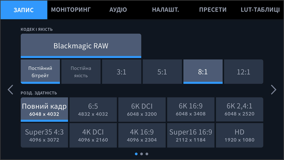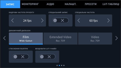 Вкладка «ЗАПИС» дозволяє швидко вибирати формат, кадрову частоту та інші параметри запису. Якщо торкнутися піктограми Blackmagic RAW, оператору буде запропоновано доступні варіанти стиснення та роздільної здатності. Це меню також містить цілу низку інших опцій, таких як динамічний діапазон (фільм, відео або покращене відео), обмежений режим використання сенсора, бажана карта для зберігання кліпів, уповільнена зйомка та рівень різкості.