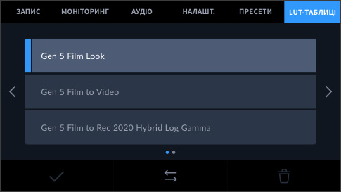 LUT-таблиця дозволяє під час зйомки переглядати записуваний контент із певними колірними налаштуваннями. Коли вона використовується, у верхньому лівому кутку екрана відображається її індикатор. Якщо LUT-таблиця зберігається в записаному кліпі, піктограма світитиметься синім кольором.