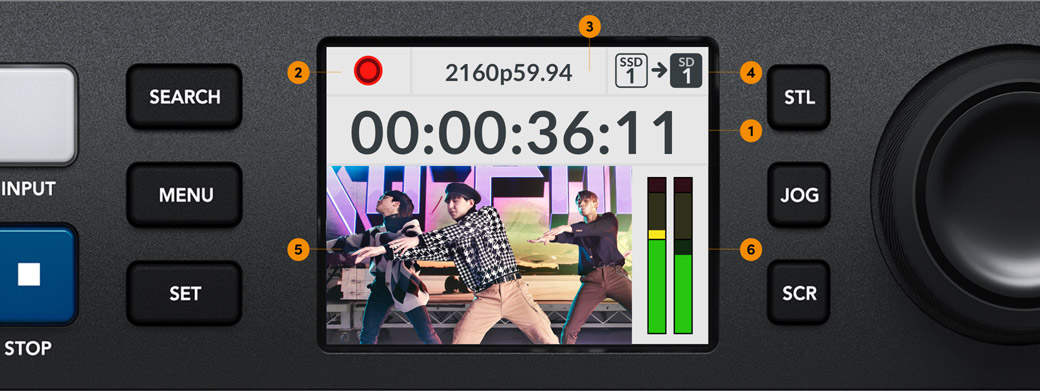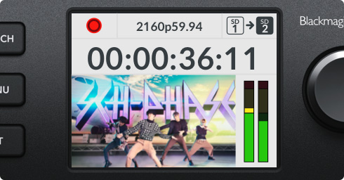 HyperDeck Studio має РК-дисплей, на який виводяться відео та індикація звуку, а також інформація про стан пристрою. Тут відображаються формат і кадрова частота, режими запису, відтворення та протягування, відомості про активний слот накопичувача та тайм‑код.