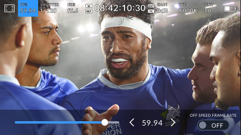 You can set URSA Broadcast G2 from 23.98 all the way up to 60 frames per second. This means you can operate at any television standard used in broadcast. Plus you can setup an off speed rate for shooting smooth slow motion. Just press the HFR button to enable the off speed rate!