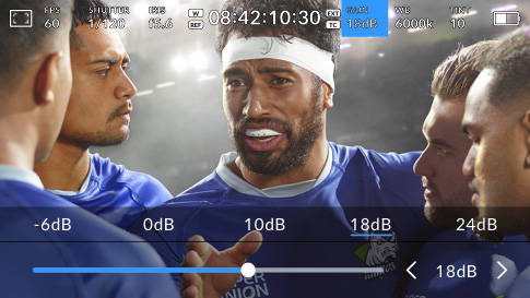 Blackmagic URSA Broadcast G2 has wide dynamic range and extremely good low light sensitivity. Tapping the gain icon lets you quickly set the ISO of the camera for best performance. It’s a realtime interactive control so as you adjust the setting, you can see the immediate effect on your images!