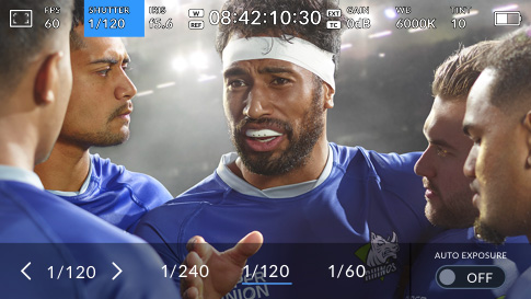 URSA Broadcast has the easiest to use shutter speed control of any camera! Shutter speed lets you set the amount of motion blur or to compensate for varying light conditions. You can set the speed manually, or the camera will suggest a range of shutter speeds to eliminate flicker from lights!
