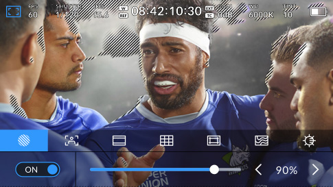 Blackmagic URSA Broadcast lets you enable different monitoring tools with a few simple taps! Tapping the monitor icon brings up an overlay for toggling between and adjusting settings. You can adjust zebra settings for checking exposure, focus assist tools, frame guides, grids and more!