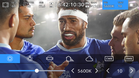 The heads up display, or HUD, controls have the most important camera controls such as frame rate, iris, timecode, cloud and streaming status, shutter angle, white balance, gain and audio levels. For example, you can adjust settings such as white balance by touching the WB indicator, or you can change the audio levels simply by touching the audio meters. It's that easy! Everything is interactive, so if you tap any item you can instantaneously change its settings without having to search through complex menus! You can even clear the LCD of all text placed over the image area by swiping up or down with your finger.