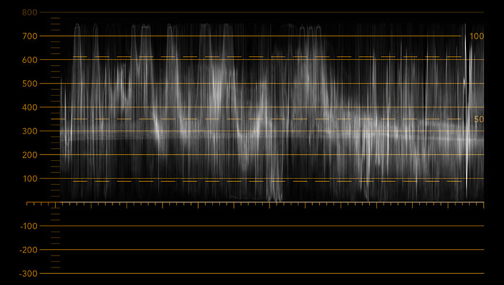 The real time RGB parade waveform view is the ideal scope for accurate color correction. You can see the color balance in ‘blacks’, ‘mids’ and ‘whites’, making it easy to balance colors for perfect looking images. RGB Parade lets you check for illegal colors because any video that drops below the black line, or above the 100% line, is an illegal RGB color! Vectorscope view cannot show illegal video levels, because vectorscope only plots colors and not the luminance component of video. However the RGB parade plots your video as R, G and B and so is the perfect way to keep track of illegal video levels! You can also select YUV parade display which shows the YUV component video as its transmitted down the SDI cable and is perfect for broadcast engineering analysis of SDI signals.