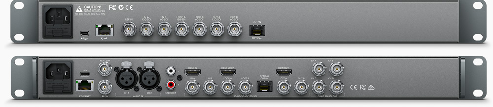 Teranex Express and Teranex AV feature multi‑rate 12G‑SDI connections that are compatible with all of your existing equipment and work with all formats up to 2160p60! They can even convert between single link 12G‑SDI and dual link 6G‑SDI or quad link 3G‑SDI. Teranex AV also includes HDMI 2.0a, XLR for balanced analog or digital AES/EBU audio, and consumer HiFi connections, along with rear brackets that protect all of the cables from being bent when installed in tight spaces! Both models feature a reference input, ethernet for remote control, and an industry standard optical fiber socket that lets you install optional fiber modules so you can run video and audio over massive distances!